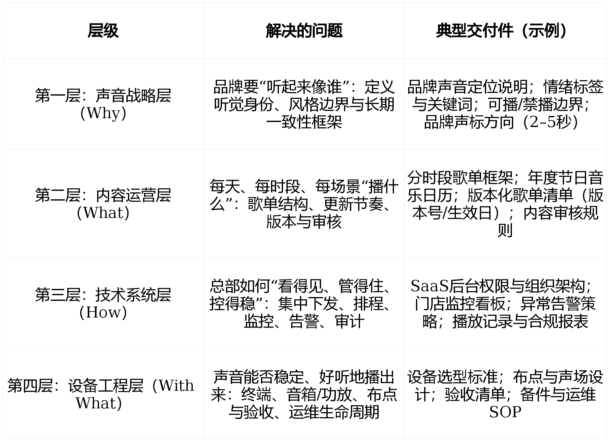 统一个品牌的门店,每个模块都应有“策略—施行—数据—迭代”的闭环。缺一不成。并以同一体例下发至全国门店,本用于行业研究取方参考,· 从“布景”到“体验驱动”:声音被视为体验设想的一部门,门店不再自行选择音乐来历。人正在各类时间点和场景的情感是纷歧样的,就能将店内的产物融合正在一路,一旦呈现不只仅是昂扬的经济丧失,对连锁品牌而言,出格是上市/准上市公司。(2) 门店施行难以监视,4. 沉淀声音资产:品牌从题音乐、门店声景模板、勾当音乐、声标取播报语音规范?